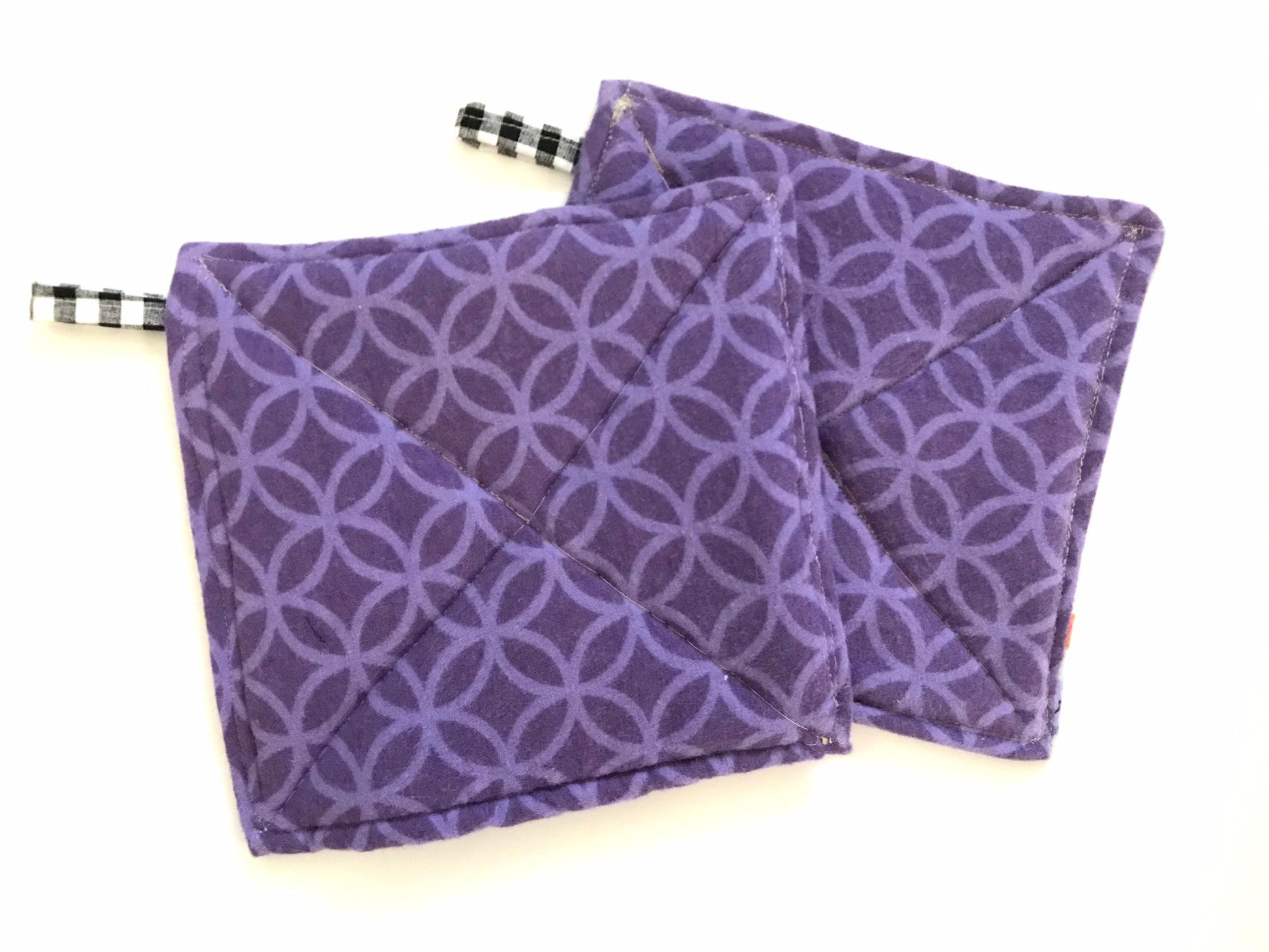 Donut you want these potholders? They are 100 percent cotton and will add a pop of fun to any kitchen. This listing is for two potholders made from cotton prints. Potholders measure 7" by 7". With a loop at the top for hanging. Made with several layers of thick upcycled fleece to protect hands from heat.