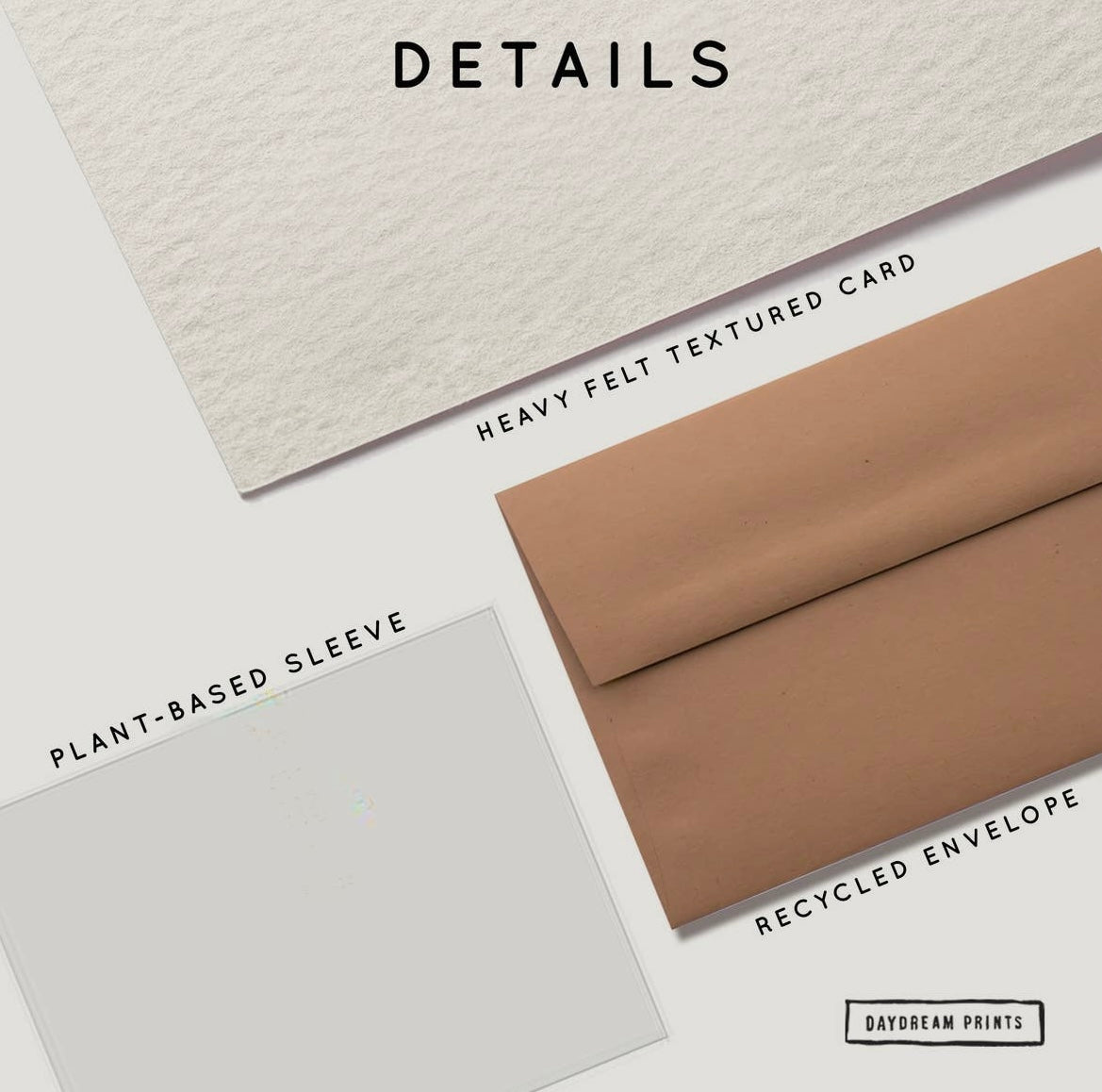 ☀ A2 size blank inside (4.25" x 5.5") ☀ Digital print on a quality, felt textured card ☀100% recycled envelope ☀ Packed in an eco-friendly biodegradable clear sleeve ☀ Made locally in Portland, Oregon, USA.