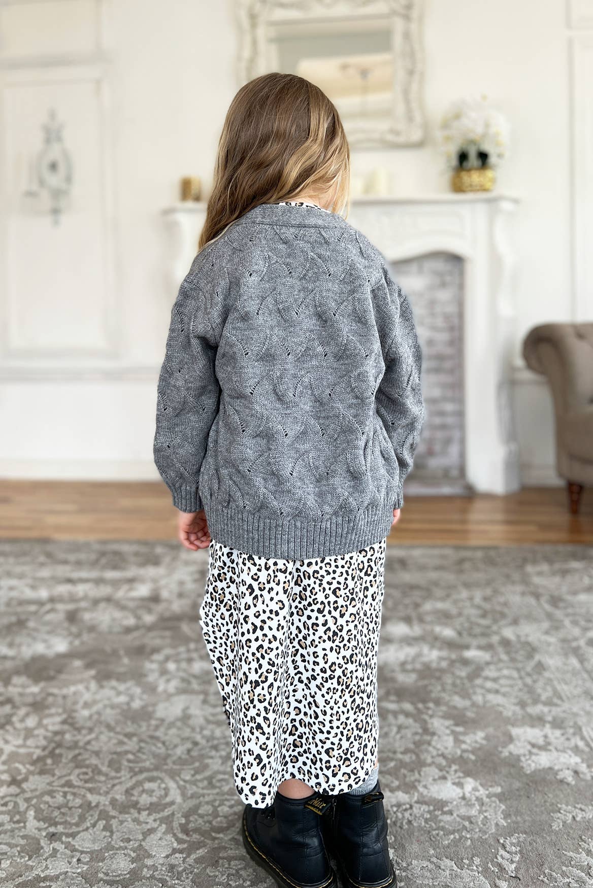 Join the cozy club with our Kids Twist Knit Cardigan! This solid, charcoal grey sweater features a unique twisted knit design and button fastening for easy wear. Keep your little ones warm and stylish all season long.