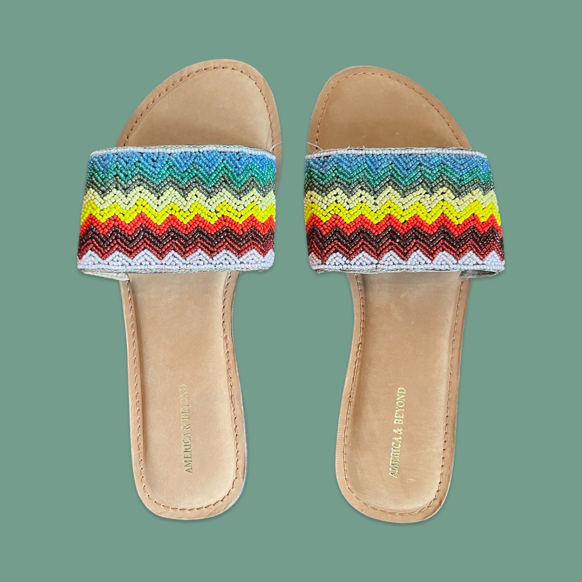 Step out and show off with these style-ready hand beaded slide sandals! Featuring an eye-catching chevron rainbow embellishment, these beauts are made with genuine leather for a comfortable open-toe design. With a luxe handcrafted accent, these sandals have the goods to take you from sunny days to starry nights in style.