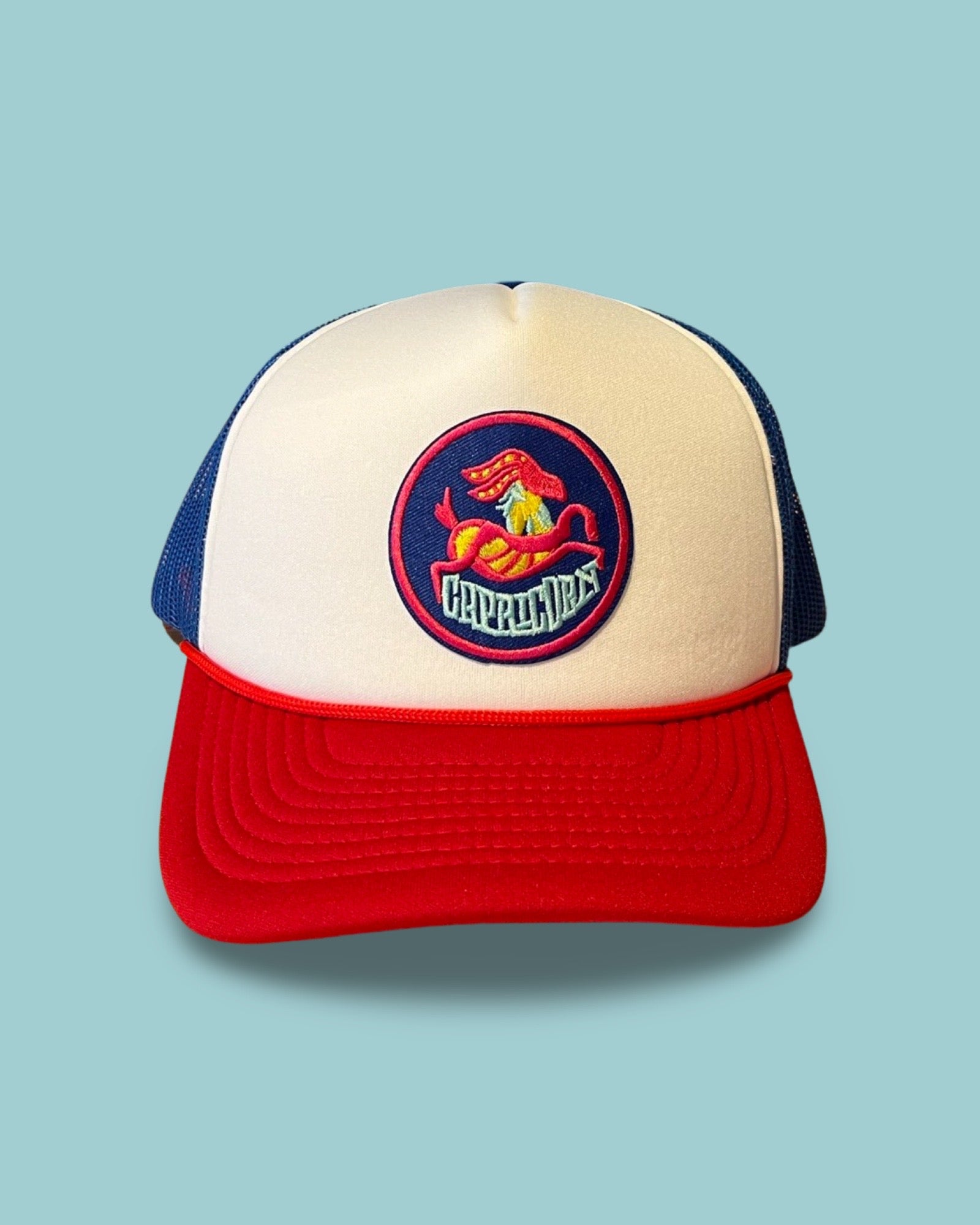 Get your head in the stars with The Essential Zodiac Trucker Hat! This classic trucker hat features a red, white and blue design with a Capricorn zodiac patch. Handmade at our Laguna Beach shop, it's perfect for showing off your astrology love.